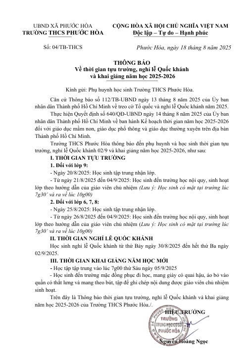Quyết định tổ chức lại trường THCS Phước Hòa